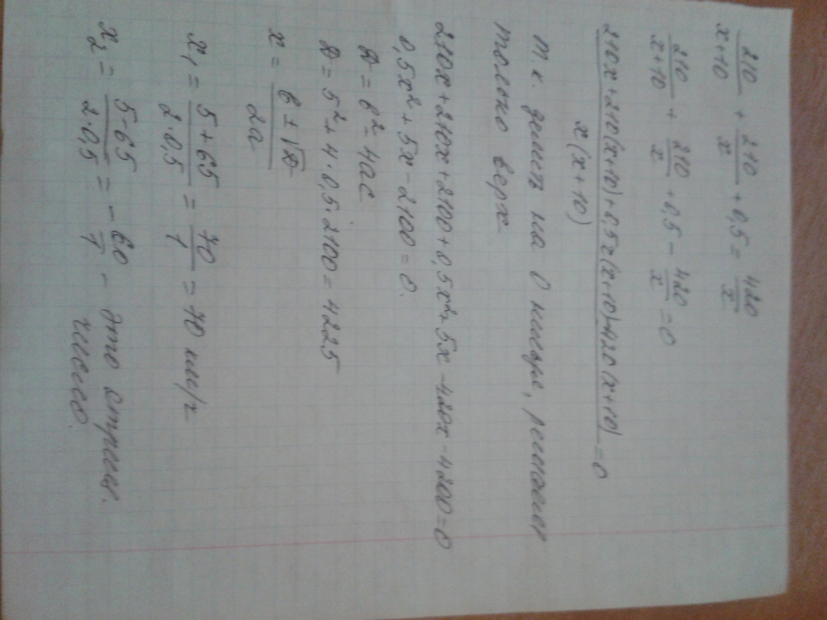 Пусть х км/ч скорость поезда в начале пути, тогда после остановки у светофора скорость стала (х+10) км/ч. Половину пути (420:2=210 км) поезд прошел за 210/х часов, потом 0,5 ч. стоял на светофоре, и после затратил 210/(х+10) часов. Так как все расстояние он должен был пройти за (420/х) часов, составляем уравнение: