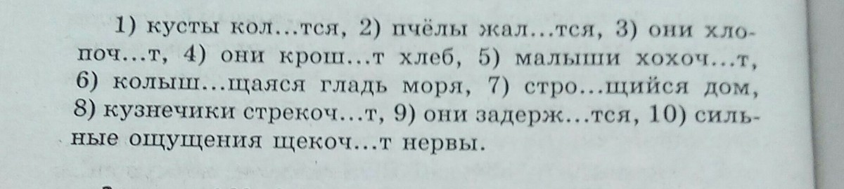 Кусты (кол)ют^ся^(I спр), пчелы (жал)ят^ся^(II cпр), они (хлопо)ч^ут^(Iспр), они (крош)ат^(I спр) хлеб, малыши (хохо)ч^ут^(I спр), (колыш)ущ^а^я^ся^ (1 спр) гладь моря, (стро)ящ^ий^ся^ дом, кузнечики (стреко)ч^ут^(1спр) , они за(держ)ива^ют^ся^(1 спр), сильные ощущения (щеко)ч^ут^(1 спр) нервы.