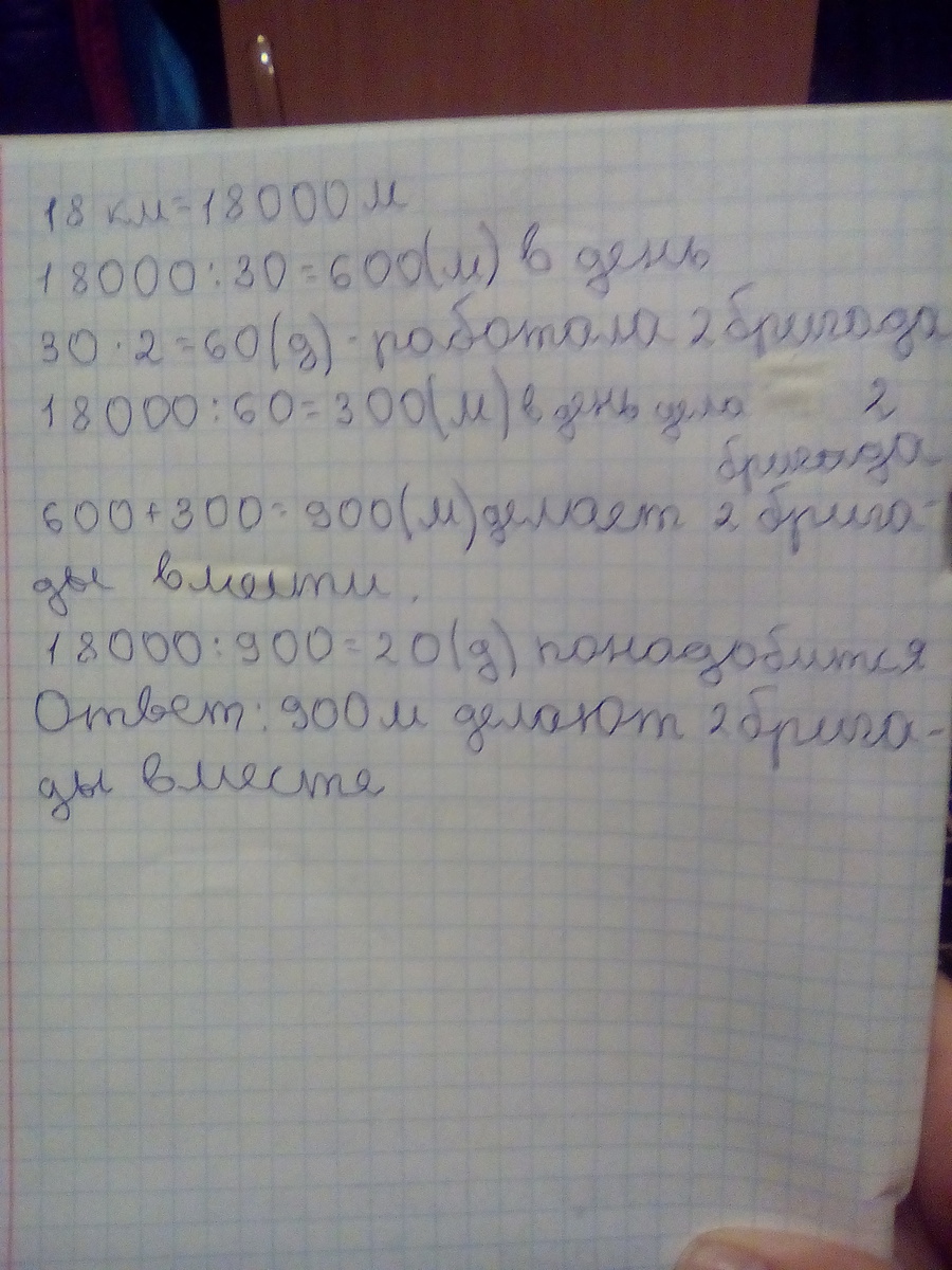 Одна бригада рабочих может заасфальтировать 18км дороги за 30 дней, а другая - в 2 раза дольше. За сколько дней смогут заасфальтировать эту дорогу обе бригады, работая вместе?