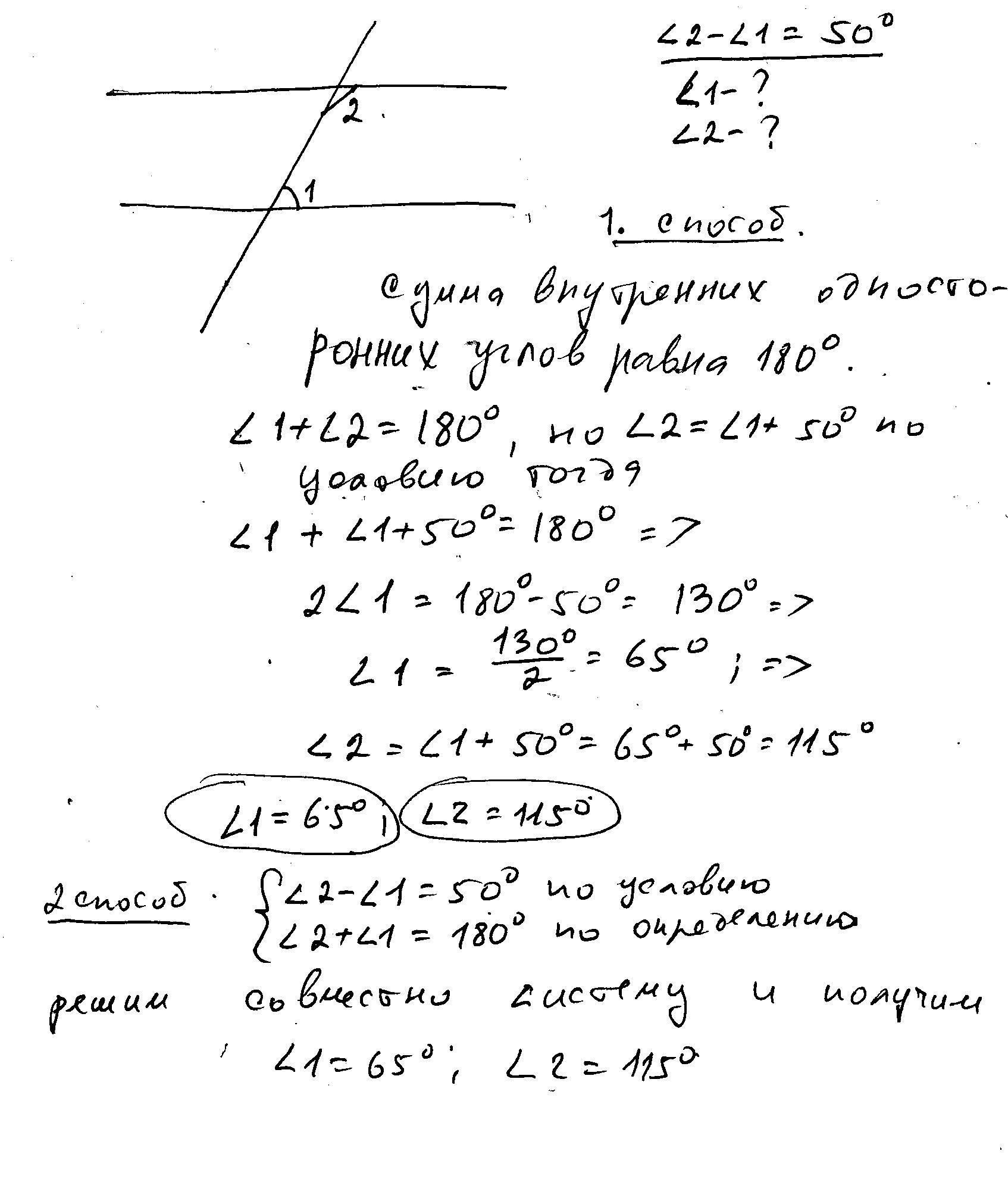 разность двух внутренних односторонних углов при пересечении двух параллельных прямых секущей равна 50градусов. найдите эти углы