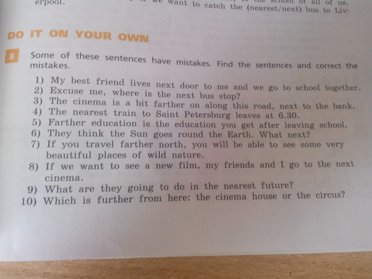 1 + верно 2 + верно 3 + верно 4 + верно 5 Вместо Farther лучше брать Further т.к. Farther берётся, когда говорим о расстоянии, а further, когда говорим о времени) 6 Во 2 предложении пропущен глагол is : What's next? 7 farther to the north 8 вместо near надо взять его превосходную степень to the nearest cinema. 9 + верно 10.+ верно