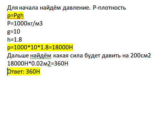плоскодонная баржа на глубине 1,8м от уровня воды в реке получила пробоину площадью сечения 200 см^{2}. С какой силой надо давить на доску, которой закрыли отверстие, чтобы сдержать напор воды?