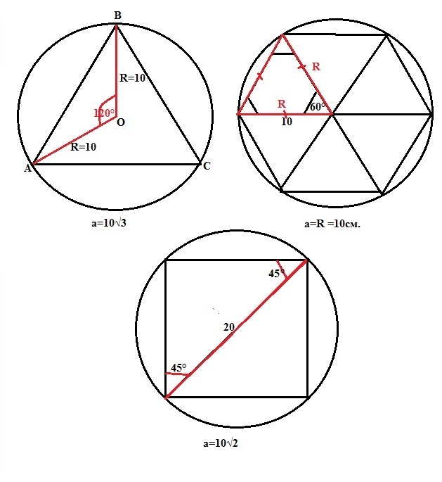 Радиус окружности равен 10см .Найдите стороны вписанного в окружность правильного треугольника ,правильного четырехугольника , правильного шестиугольника .Пожалуйста с решениеи .