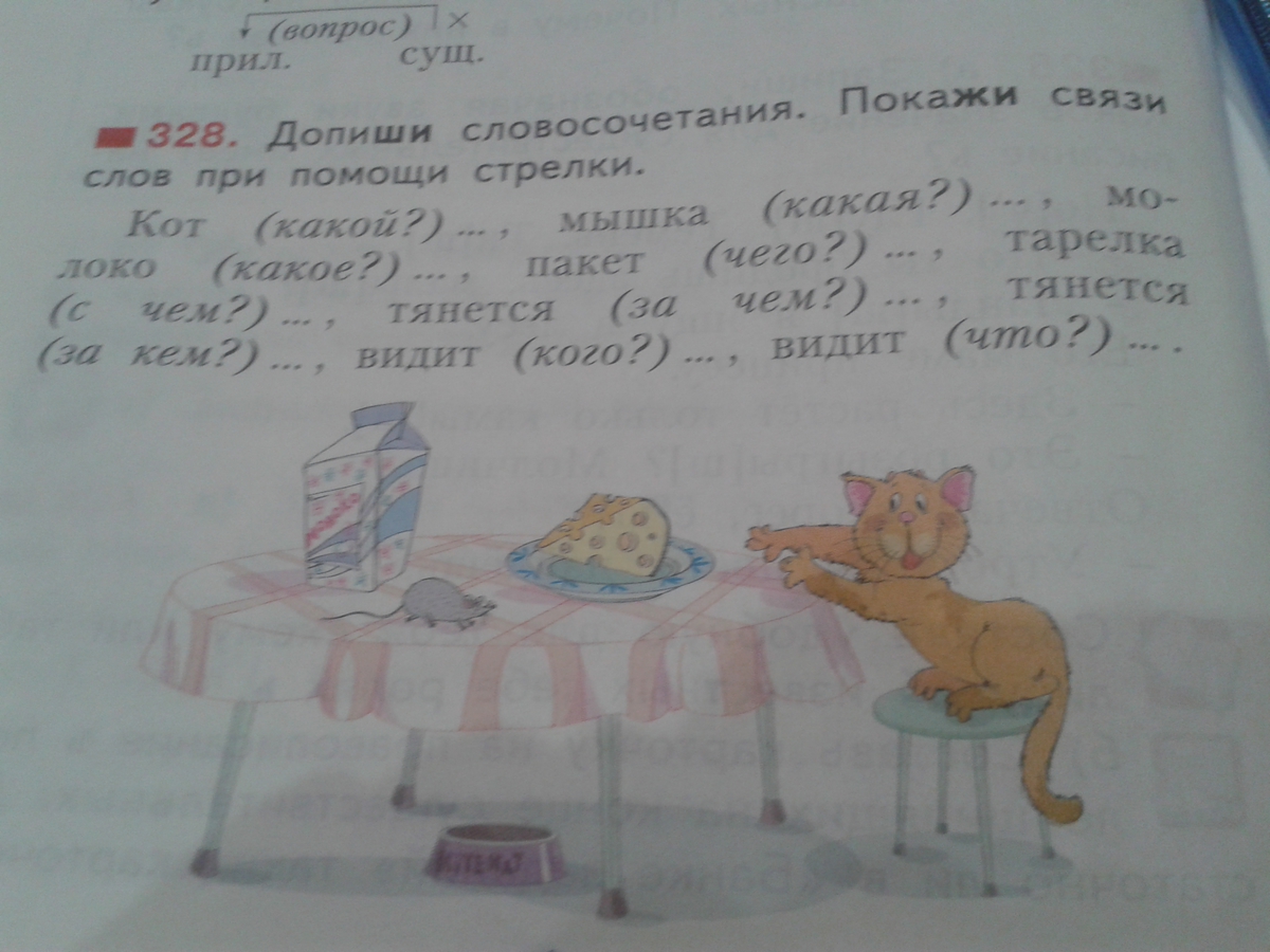 Кот хитрый, мышка маленькая, молоко свежее, пакет молока, тарелка с сыром, тянется за сыром, тянется за мышкой, видит кота, видит сыр. Поставь стрелки от первого слова ко второму-это будет связь слов.
