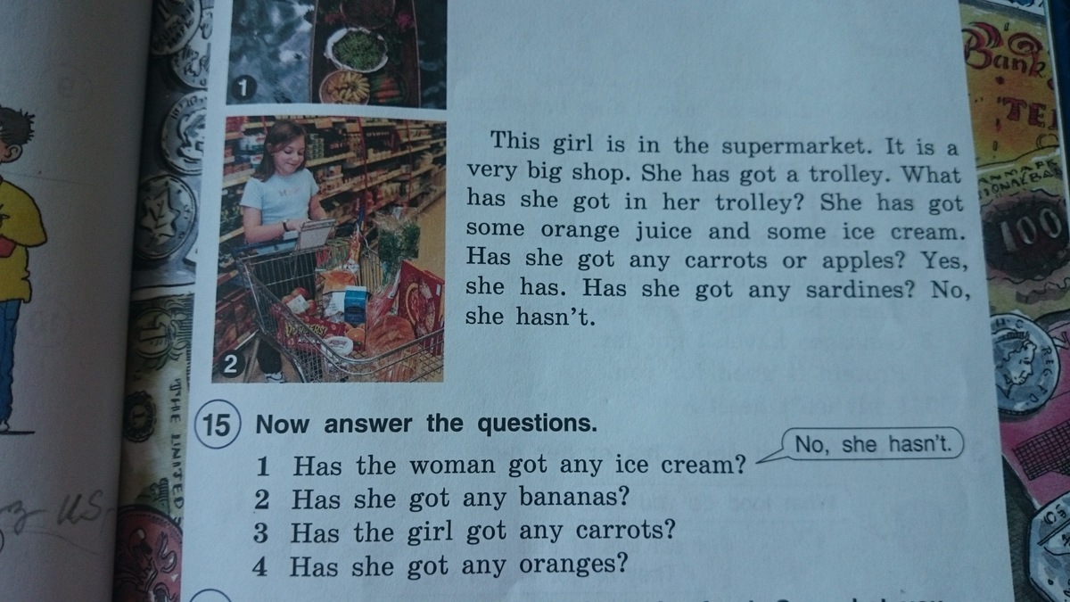 Эта девушка в супермаркете. Это очень большой магазин. Что у нее есть в тележке? У нее немного апельсинового сока и мороженого. У нее есть морковь или яблоки? Да, они у неё есть. У нее есть свои сардины? Нет, у неё их нет.