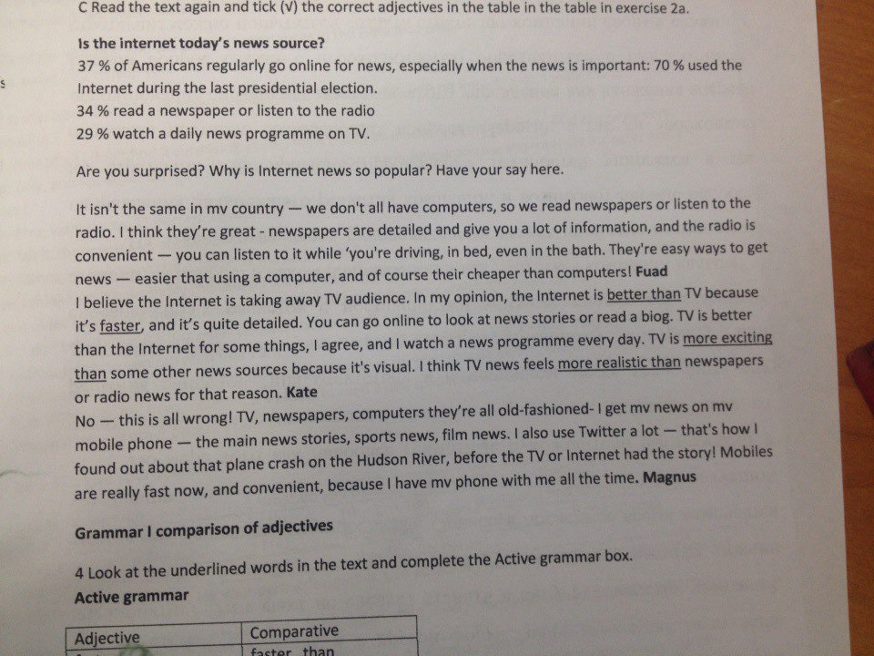 Вы удивлены? Это не то же самое в мВ стране мы не все имеют компьютеры, так мы читаем газеты или слушать радио. Я думаю, что они большие газеты подробно и дать вам много информации, и радио удобно вы можете слушать в то время как "вы за рулем, в постели, даже в ванной. Они простые способы, чтобы получить новости легче, что с помощью компьютера, и, конечно, их дешевле, чем компьютеров Фуад верят Интернет забирает телезрителей. На мой взгляд, Интернет лучше, чем телевидение, потому что это быстрее, и это достаточно подробно. Вы можете выходить в интернет, чтобы посмотреть на новости Истории или читать BioG. ТВ лучше, чем в Интернете для некоторых вещей, я согласен, и л смотреть программы новостей электронной день. Телевизор более захватывающим, чем некоторые другие источники новостей, потому что это визуально. Я думаю, что ТВ-новости чувствует себя более реалистично, чем газеты или радио новости по этой причине. не Кейт Нет, это все неправильно! ТВ, газеты, компьютеры все они старые fashioned- л получить мВ новости мВ мобильного телефона основные новости, спортивные новости, кино новости. также использовать Twitter в много, что, как я узнал о том, что авиакатастрофе на реке Гудзон, перед телевизором или в Интернет имели storyl мобильные телефоны очень быстро сейчас, и удобно, потому что есть мВ телефон со мной все время. М