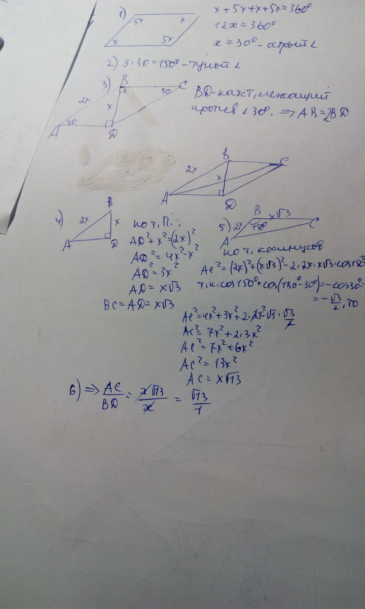 Помогите, пожалуйста! Нужно срочно Один из углов параллелограмма в 5 раз больше другого, а одна из его диагоналей является высотой. Найдите отношение диагоналей параллелограмма.