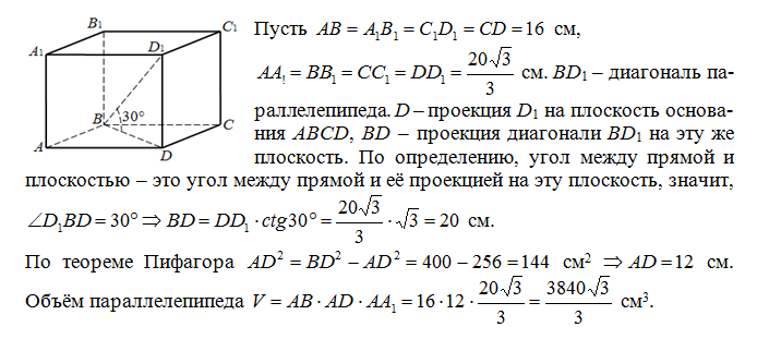 )/3 см соответственно, диагональ параллелепипеда составляет с плоскостью основания угол 30 градусов. Найдите объём параллелепипеда.