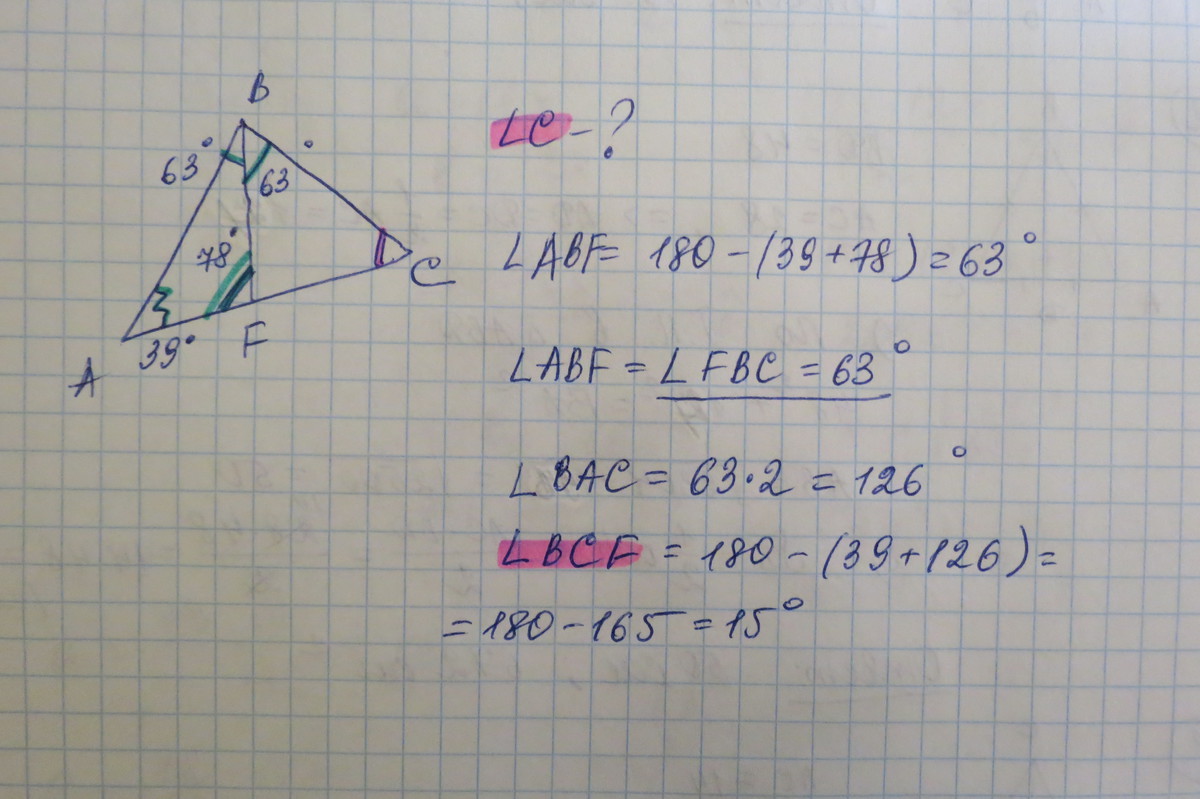 В треугольнике АВС провели биссектрису ВF. Найдите угол С, если угол А = 39 градусам, угол АFB = 78 градусам.