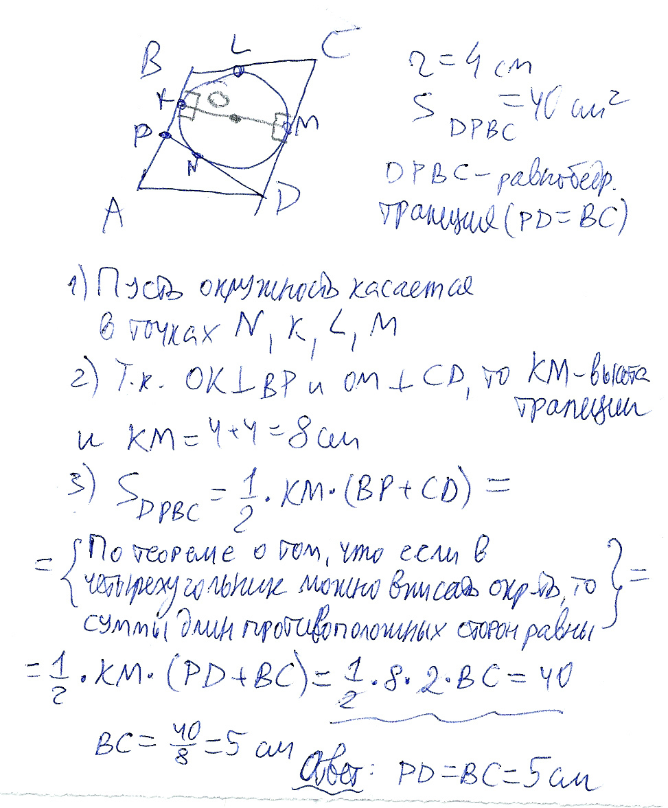 Окружность касается сторон АВ, ВС и CD параллелограмма ABCD. Касательная к окружности проходит через точку D и пересекает сторону АВ в точке Р. Известно, что длина радиуса окружности равна 4 см и площадь четырехугольника DРВС равна 40 см