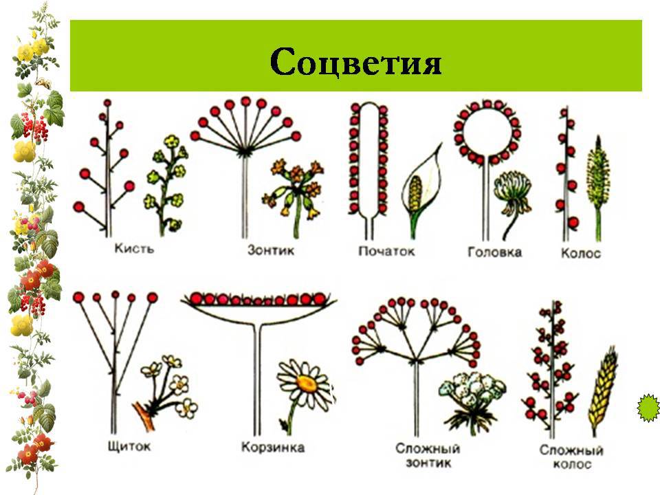 Кисть(черемуха),зонтик(вишня),початок(кукуруза),головка(цветок клевера),Колос(подорожник семена его),завиток(медуница),метелка(сирень),сложный зонтик(дягиль),корзинка(ромашка),сложный колос(рожь),щиток(рис)