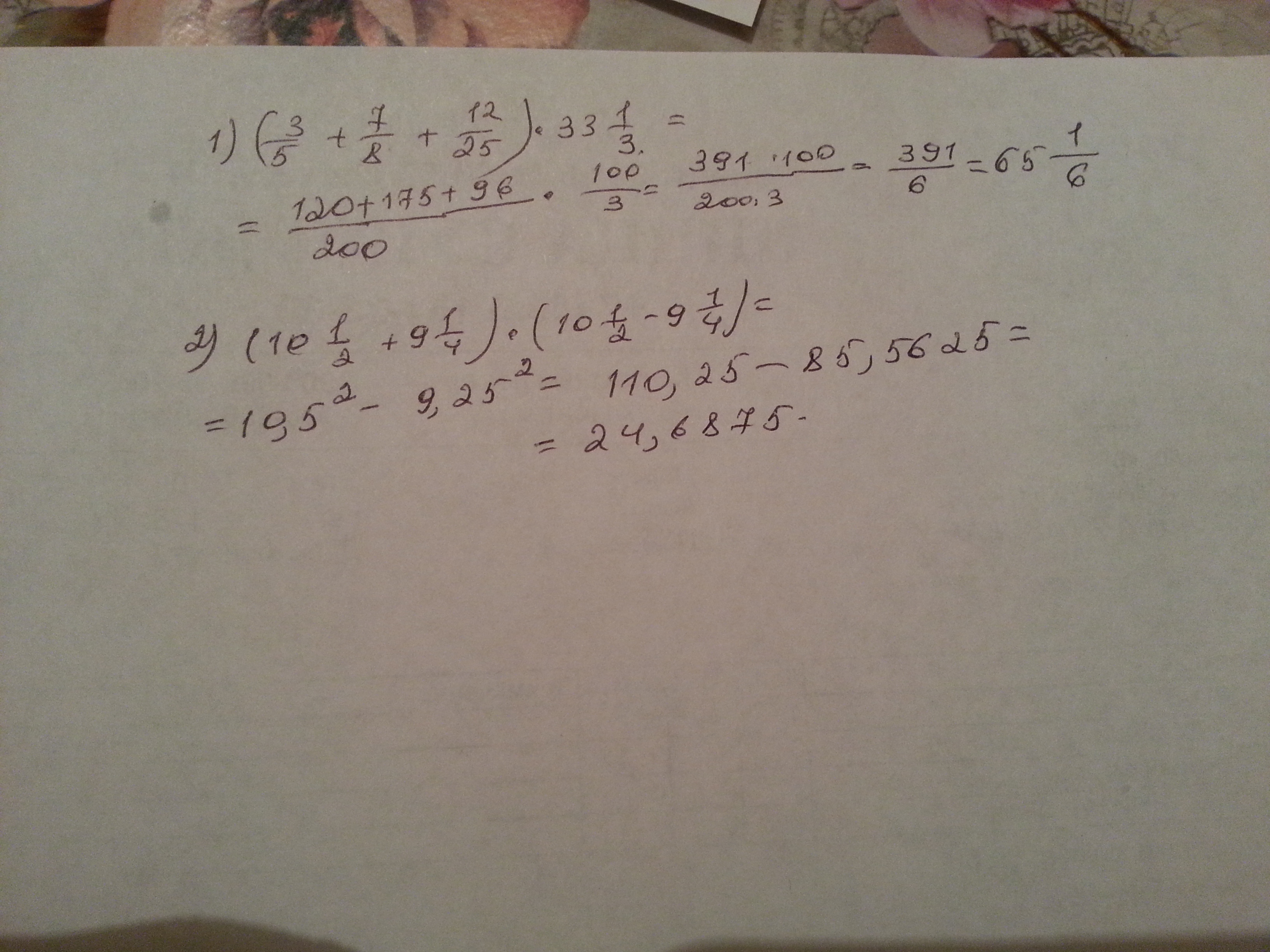 умножьте сумму дробей 3/5, 7/8 и 12/25 на 33 1/3. 2) даны два числа 10 1/2 и 9 1/4. вычислите произведение суммы этих чисел на их разность