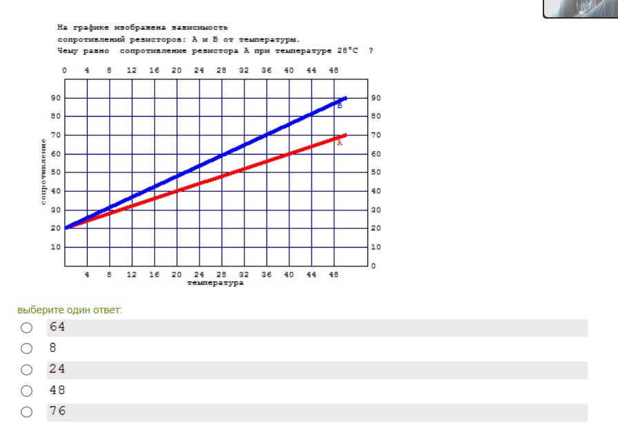 На графике изображена зависимость сопротивлений резисторов: А и В от температуры. Чему равно сопротивление резистора А при температуре 28 градусов?