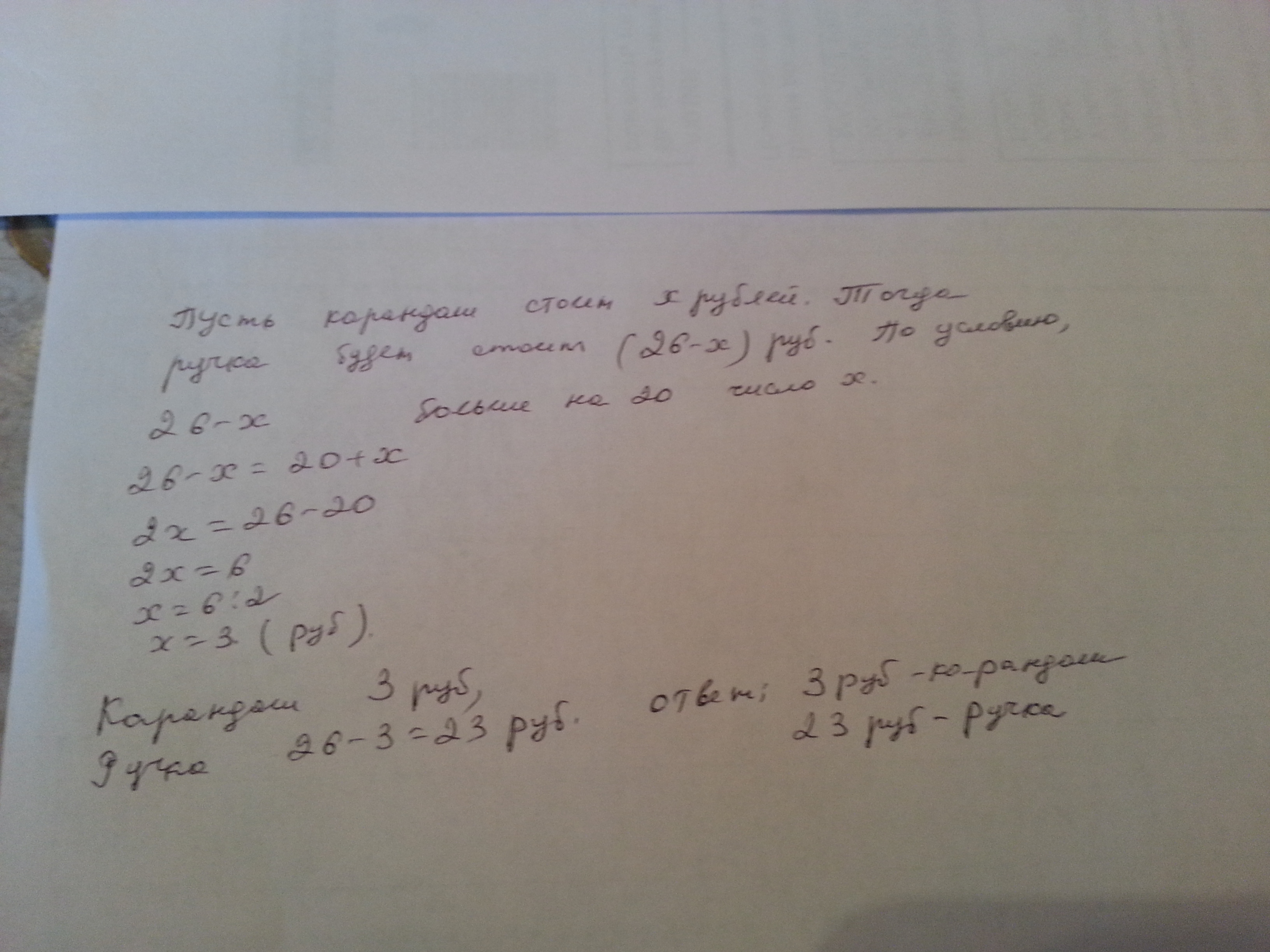 Ручка и карандаш стоят вместе 26 рублей. ручка дороже карандаша на 20 рублей. сколько стоит карандаш?