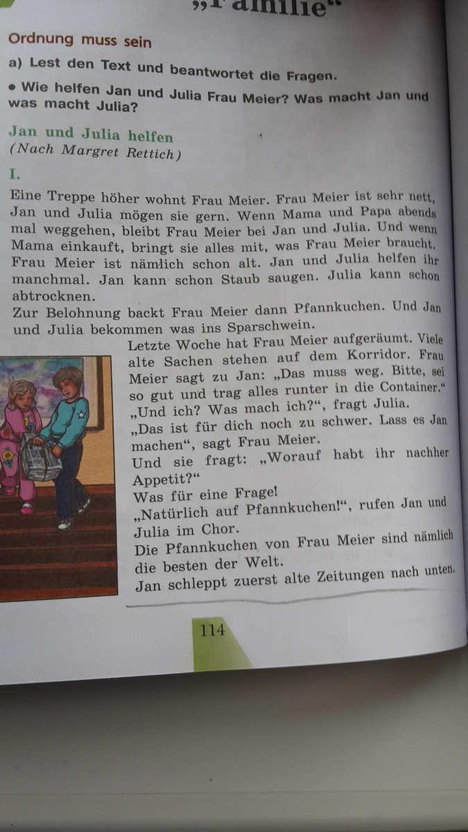 Этажом (лестницей) выше живет фрау Майер. Фрау Майер очень мила, и любит Яна и Юлию. Когда мама и папа иногда выходят по вечерам, фрау Майер остается у Яна с Юлией. Когда мама закупается она привозит (приносит) всё, что нужно фрау Майер. Ведь фрау Майер уже стара. Ян и Юлия иногда ей помогают. Чн уже может пылесосить, а Юлия протирать.