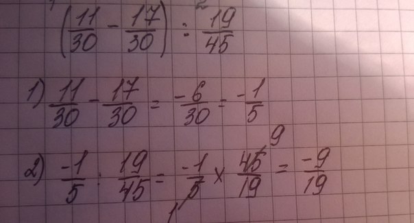 В первом действии мы просто производим вычитание в числителе, т.к знаменатель одинаковый ничего менять не нужно, оставляем как есть (30). 11-17=-6 , сокращаем на 6, остается -