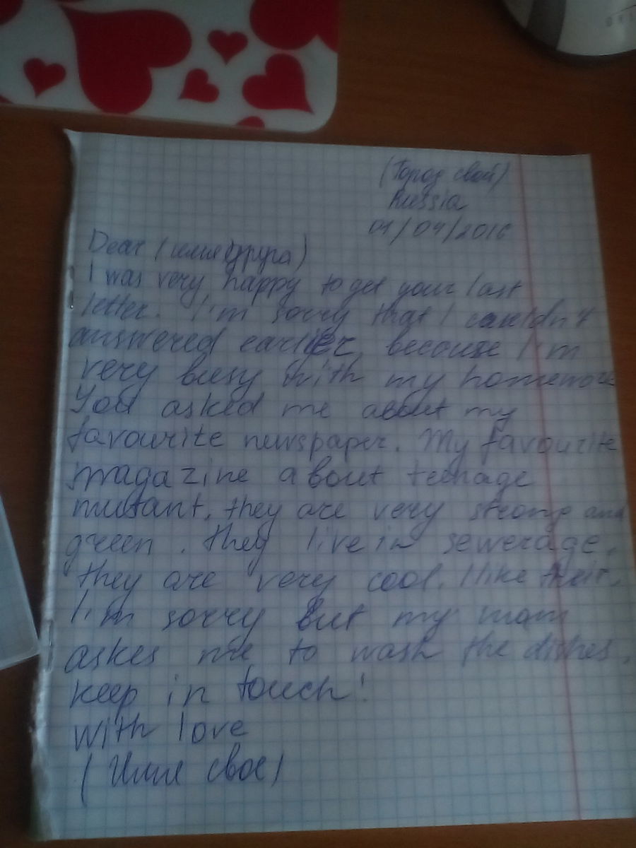 мне очень жаль что я не отвечал раньше так как я был загружен домашкой. ты спрашивал меня о моей любимой газете или журнале . так вот мой любимый журнал это о черепашках ниндзя. они очень сильные, зеленые и живут в канализации. еще они очень крутые. мне они нравятся. мне жаль но мама попросила помыть посуду . будь на связи . с любовью ( свое имя)