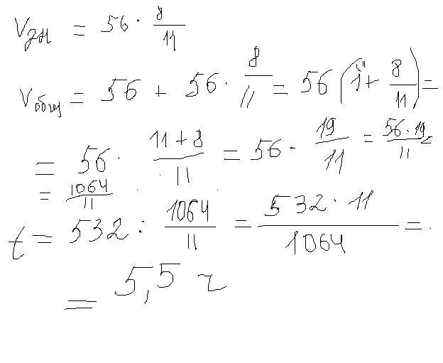 t=s/v = 532/ 56*19/11= (532*11)/(56*19) =5.5 часов
