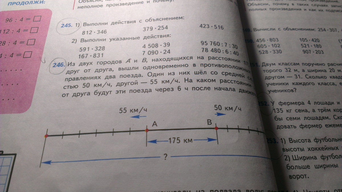 из двух городов А и В , находящихся на расстоянии 175км друг от друга, вышли одновременно в противоположных напровлениях два поезда . Один из них шел со средней скоростью 50 км/ч, другой - 55 км/ч. На каком рассстоянии друг от друга будут эти поезда через 6ч после начала движения?