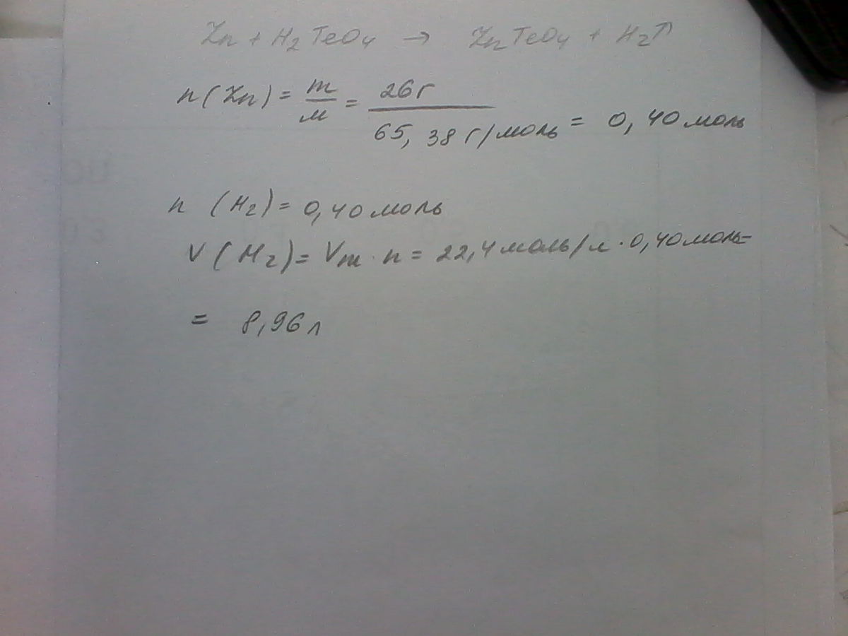 Вычисли объём водорода, который выделится в результате взаимодействия 26 г цинка с раствором H2TeO4.