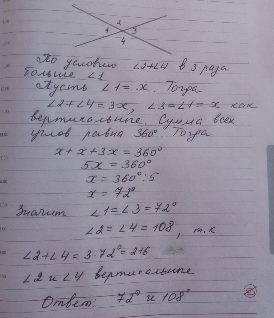 обозначим сумму вертикальных углов как 3х, значит смежный с ними угол - х, один из вертикальных углов равен 1,5х, а так как сумма смежных углов 180 градусов, то можем составить уравнение 1,5х+х=180, выразим х получим 72 градуса