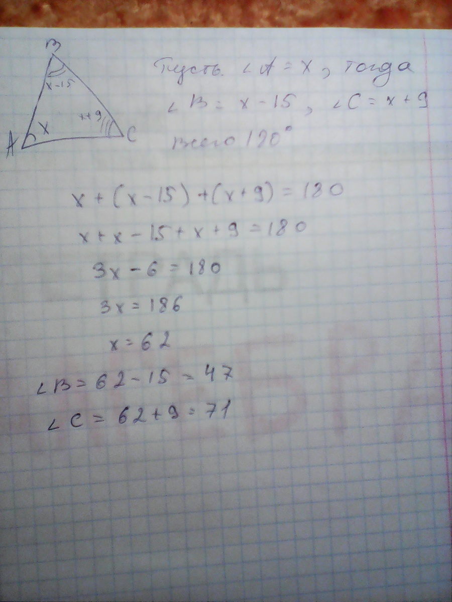 третьего на 9 градуса. Найдите углы этого треугольника. Спасибо заранее!