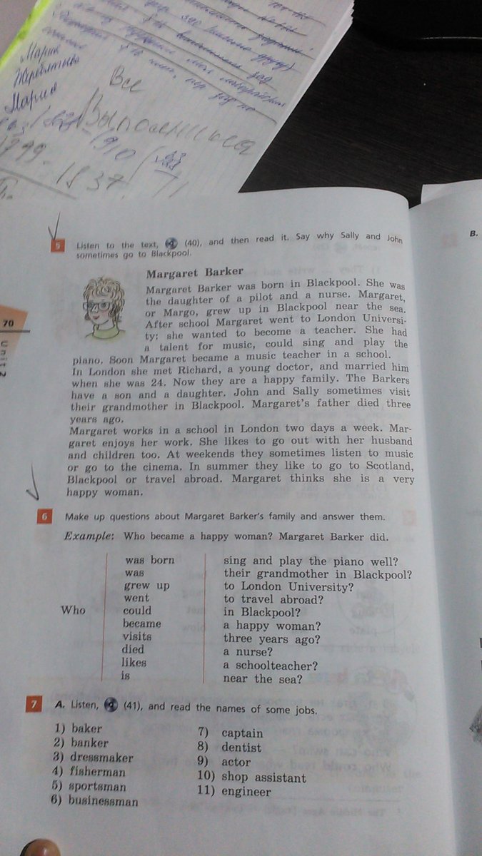 Маргарет работает в школе в Лондоне два дня в неделю. Маргарет наслаждается своей работой. Ей нравится выходить гулять с ее мужем и детьми тоже. Эти выходные они иногда слушают музыку или идут ы кино. Летом им нравятся ездить в Шотландию, Блекпул или путешествовать за границу. Маргарет думает она очень счастливая женщина.