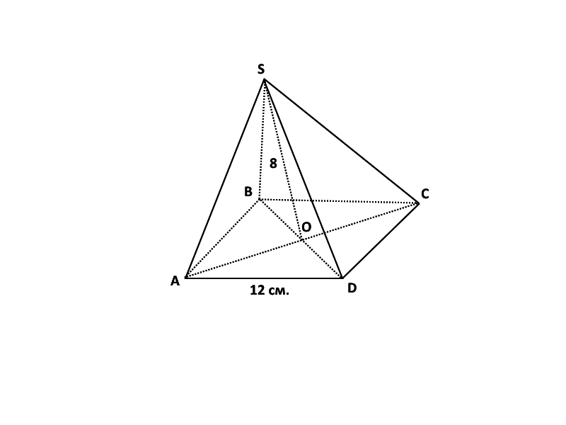 высота правильной четырехугольной пирамиды равна 8 см а сторона ее основания 12 см . вычислите : а) длину бокового ребра б)площадь полной поверхностсти пирамиды