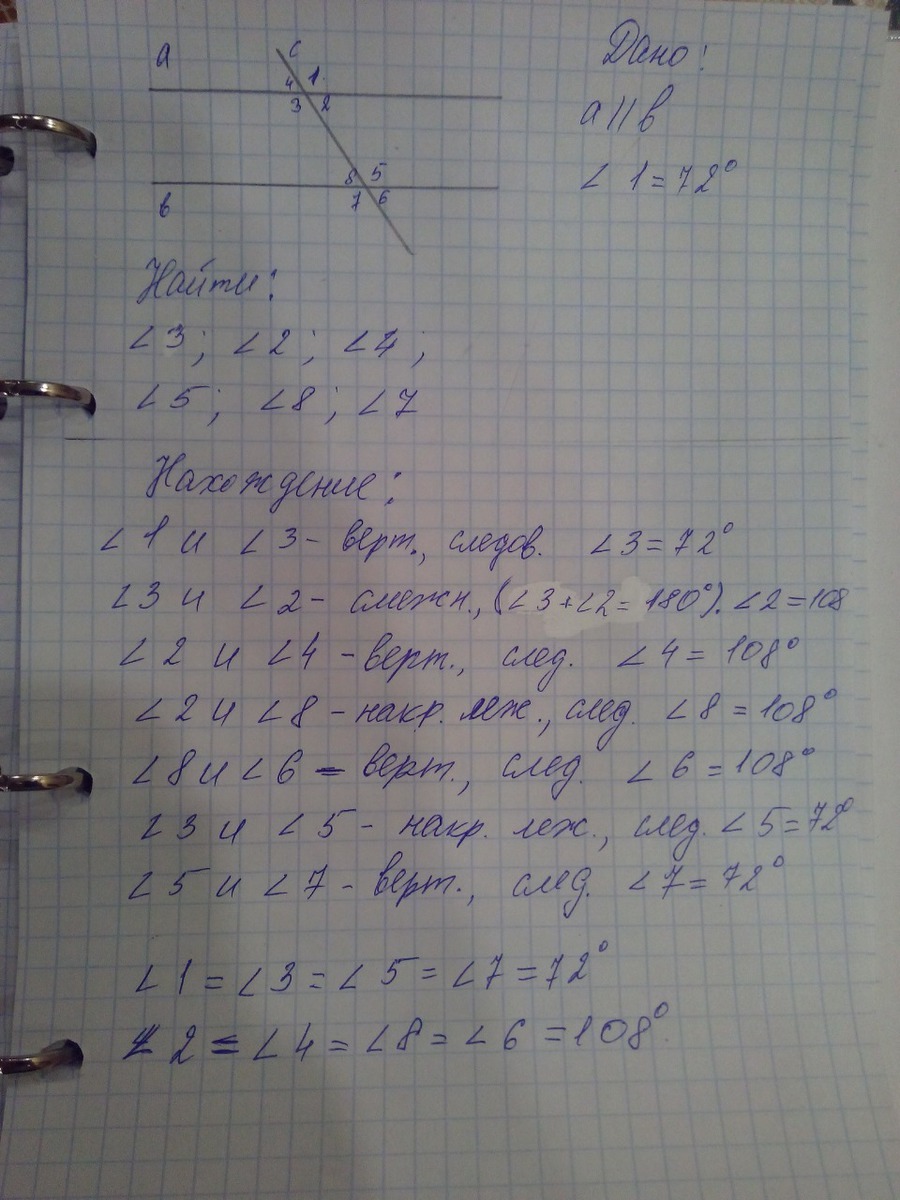 Две параллельных прямые пересечены секущей.Один из восьми образованных углов равен 72 градуса.Найдите остальные углы.