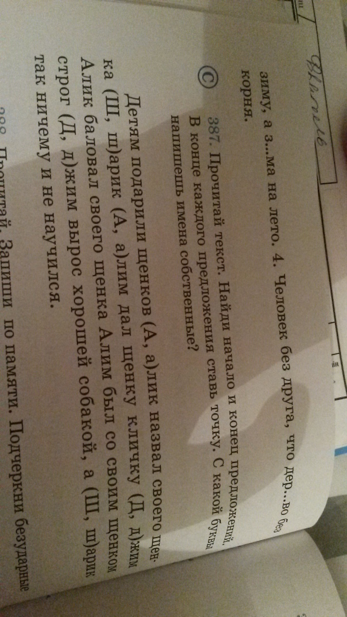 Детям подарили щенков.Алик назвал своего щенка Шарик,Алим дал щенку кличку Джим.Алик баловал своего щенка,Алим был со своим щенком строг.Джим вырос хорошей собакой,а Шарик так ничему и не научился.