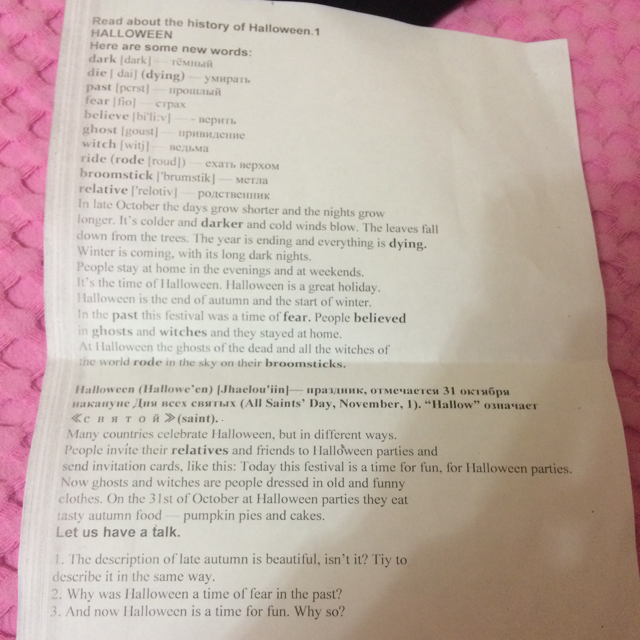 Много стран празднует Хэллоуин, но каждая делает это по-разному. Люди навещают родственником и друзей на вечеринках, посвященных Хэллоуину и отправляют поздравительные открытки, как эти: Сегодняшний фестиваль - время для веселья, для вечеринки Хэллоуина. Сейчас призраки и ведьмы, люди, одетые в старые и веселые вещи. Третьего октября на Хэллоуин они могут попробовать вкусную осеннюю еду.. тыквенный пирог и кексы
