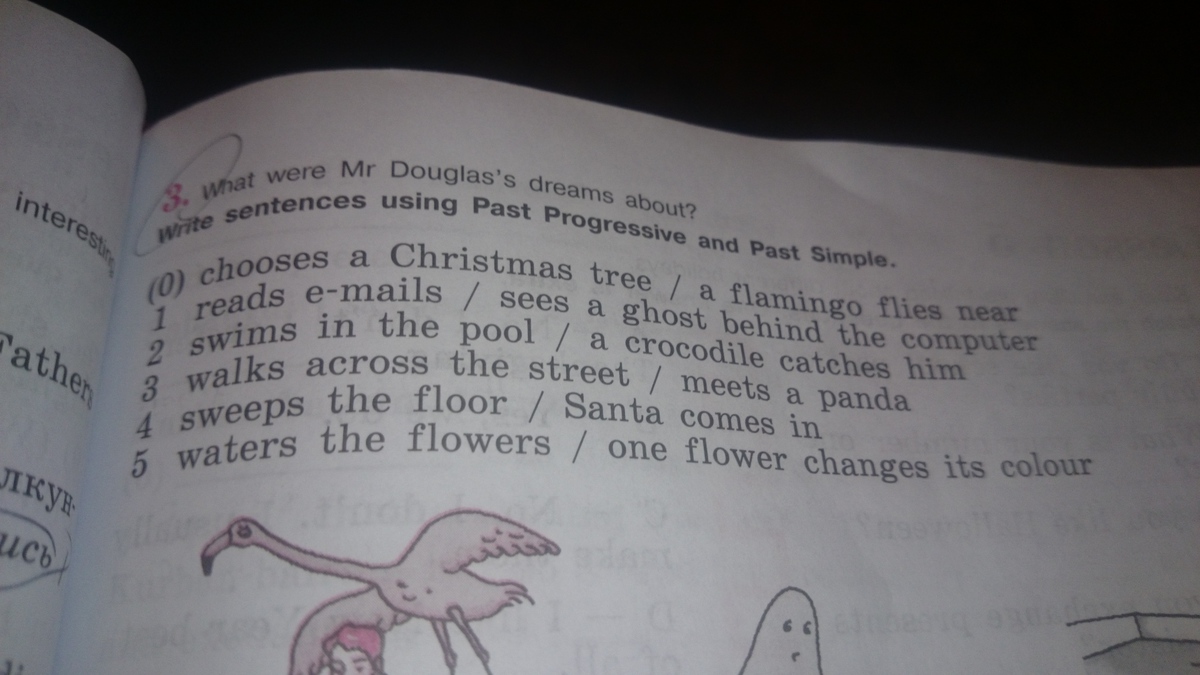 0) He was choosing а Christmas tree and a flamingo flew near. 1) He was reading e-mails and saw a ghost behind the computer. 2) He was swimming in the pool and a crocodile caught him. 3)He was walking across the street and met a panda. 4) He was sweeping the floor and Santa came in. 5) He was watering the flowers and one flower changed its colour.