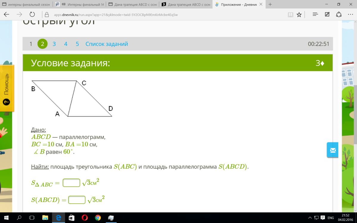 АВСД параллелограмм, АВ=ВС=10, теорема- если в параллелограмме соседние стороны равны то это ромб, АВСД ромб, уголВ=60,площадьАВСД=АВ²*sinB=100*√3/2=50√3, диагональ АС делит АВСД на 2 равных треугольника, площадьАВС=1/2площадьАВСД=50√3/2=25√3 или площадьАВС=1/2АВ*ВС*sinB=1/2*10*10*√3/2=25√3
