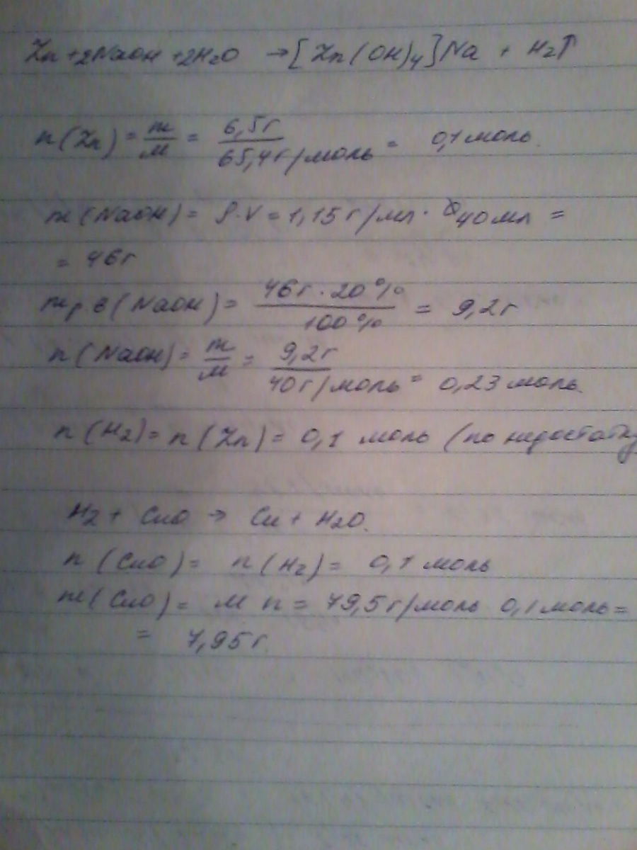 Определите объём газа который образуется при взаимодействии цинка массой 6,5 г с 20% раствором naoh объёмом 0,04 л плотностью 1,15 г/мл. Рассчитайтк массу
