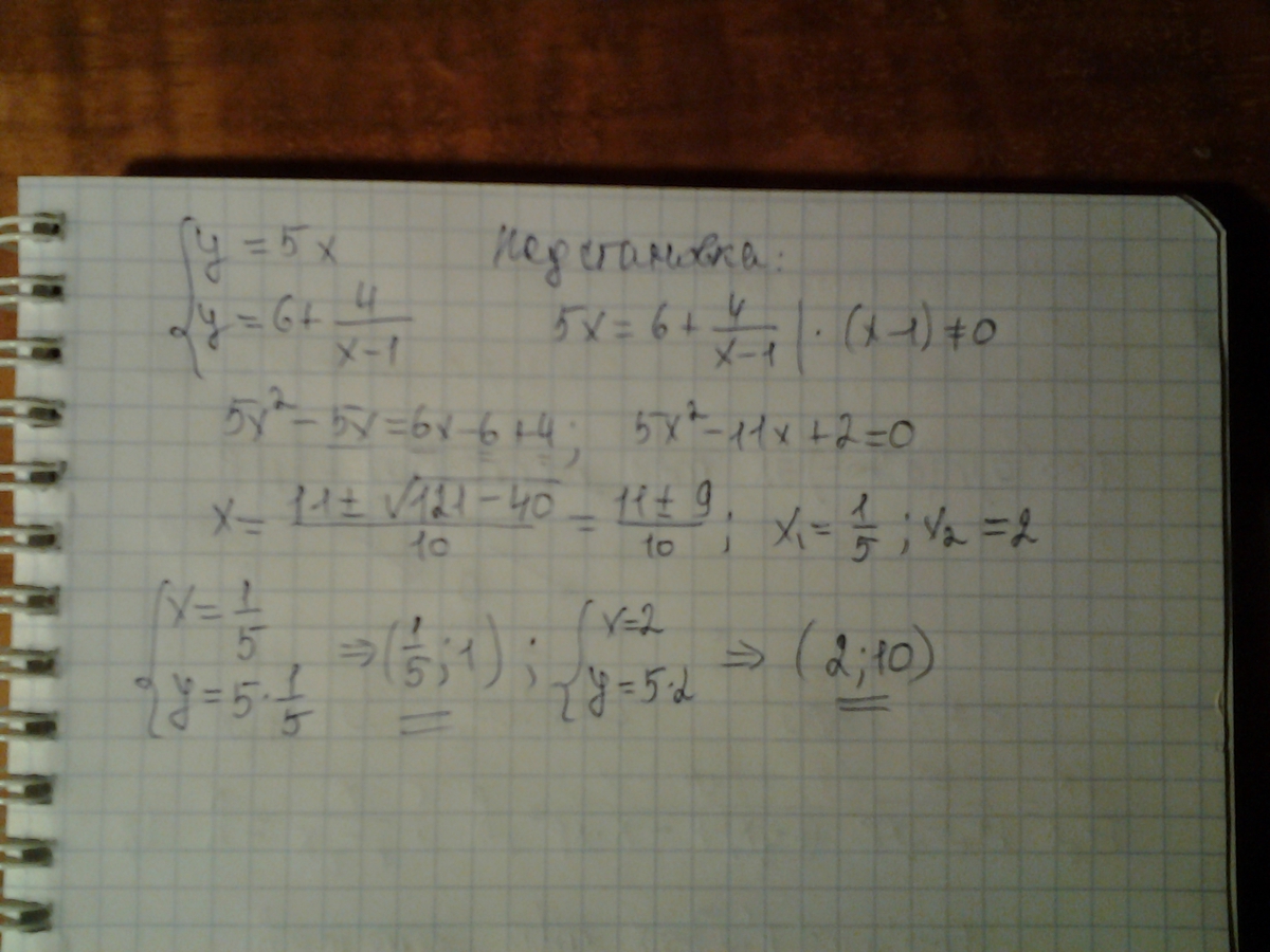 Алгебра как найти координаты точки пересечения графиков функций y=5x и y=6+ 4/x-1( самое решение уравнения )