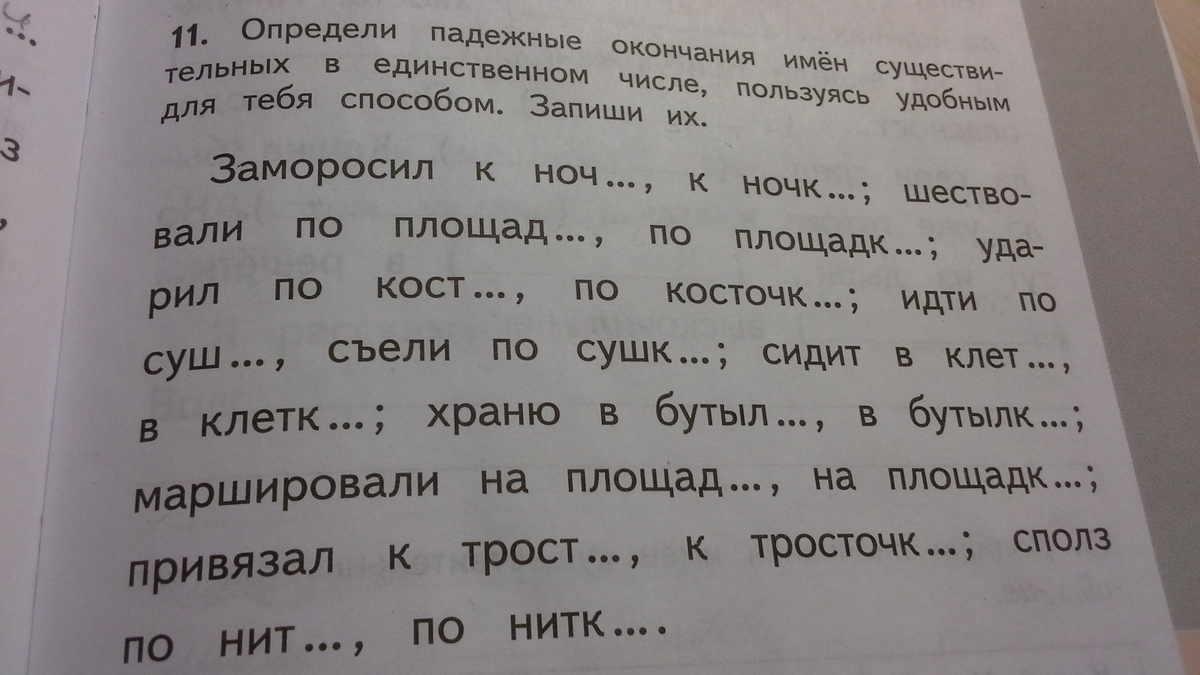К ночи, к ночке; по площади, по площадке; по кости, по косточке; по суше, по сушке; в клети, в клетке; в бутыли, в бутылке; на площади, на площадке; к трости, к тросточке; по нити, по нитке.
