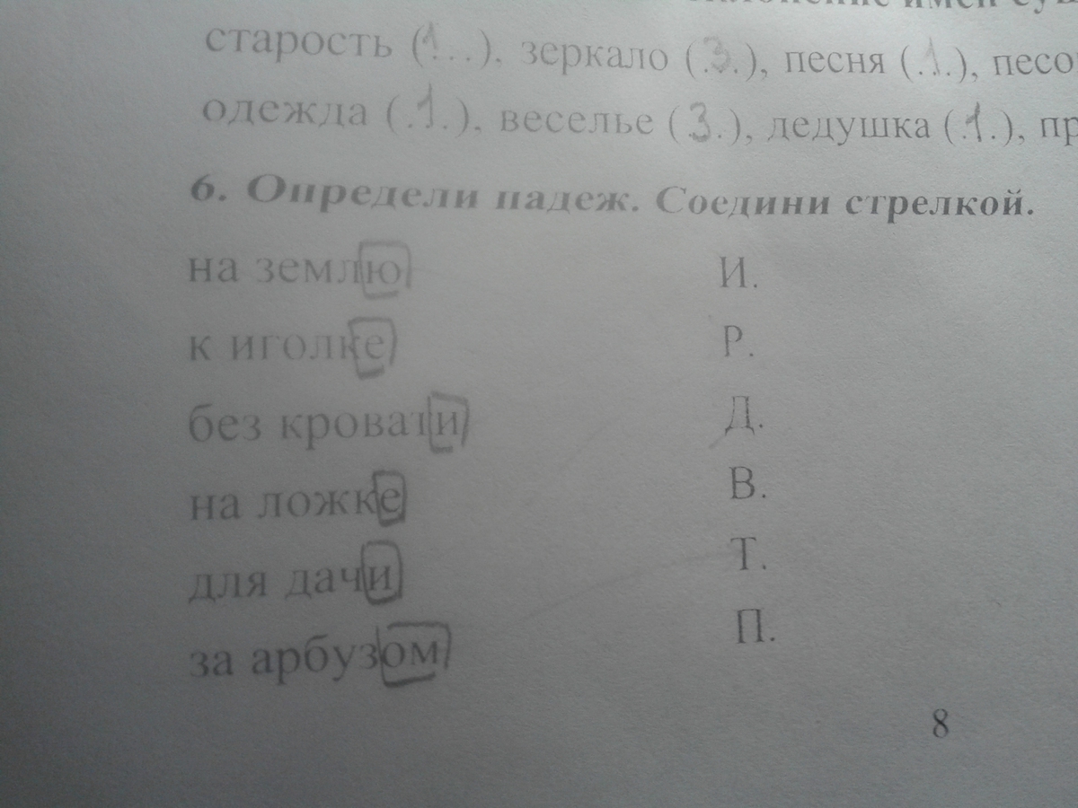 На земле П п, к иголке  д.п , без кровати Р.п,на ложке П.п, Для дачи Р.п,за арбузом  т. п