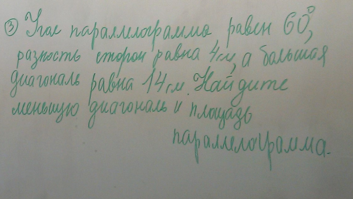 Ac^2=x^2+(x+4)^2-2x*(x+4)*0.5; 3x^2+12x-180=0; x=6;AB 6 см АD 10 см находим диагональ BD по той же теореме косинусов