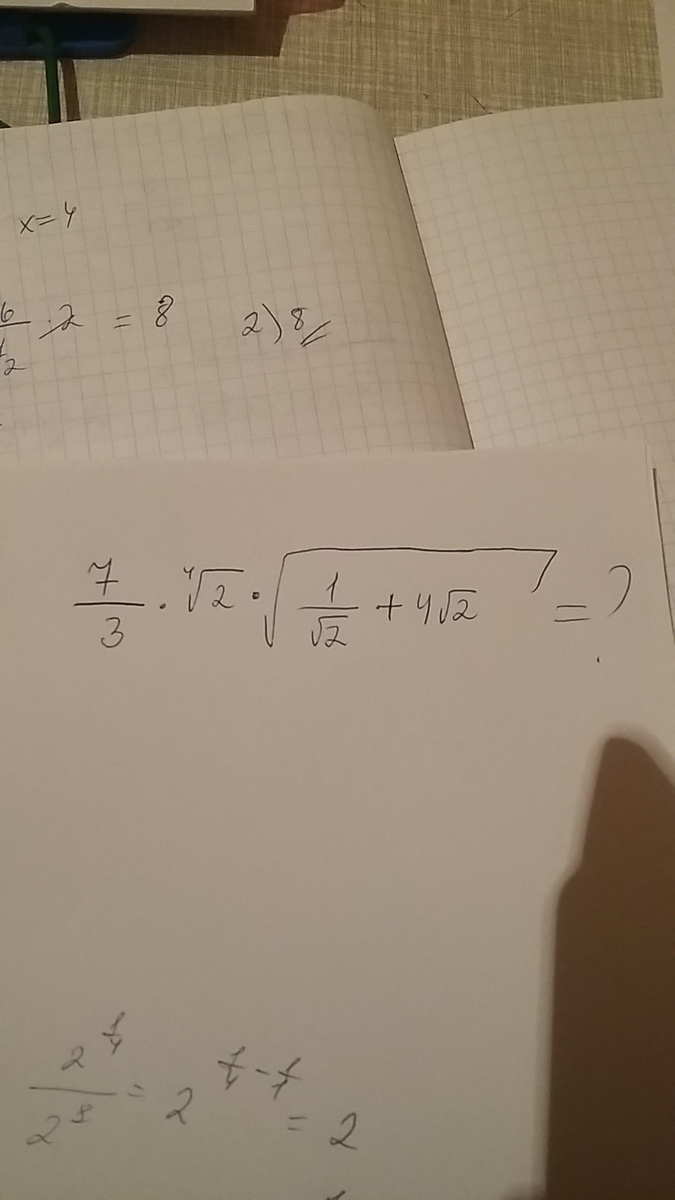 перша дія в дужках. 1/корінь з двох =корінь з двох поділити на 2. тоді останнє число + 4 корінь з двох = спільна риска дробу спільний знаменник 2 а в чисельнику 9 корінь з двох. друга дія - решта. далі можна все подати через показник наприклад корінь з двох = два в степені одна друга і т.д. відповідь 21/корінь четвертого степеня з двох.