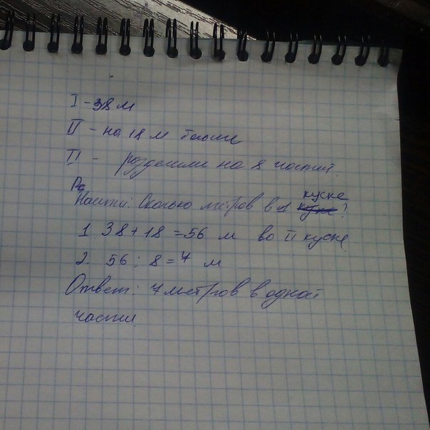 Помогите написать условие задачи? Задача:В одном куске 38 м верёвки,а в другом на 18м больше. Второй кусок разделили на 8 равных частей. Сколько метров в одной части?