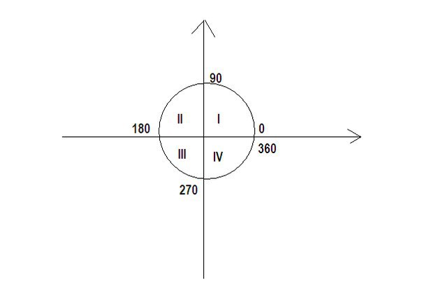 Чтобы определить четверти отрицательных углов, идём в противоположном направлении от 0, т.е. по часовой стрелке, а не против