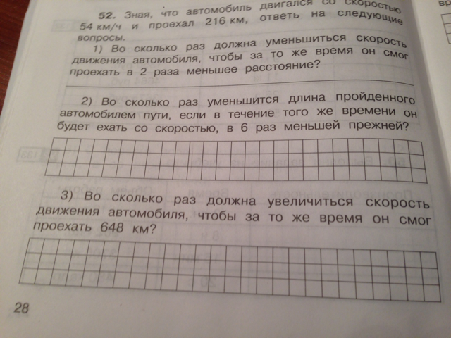 3)Чтобы за 4 часа автомобиль мог проехать 648 км, его скорость должна быть 648:4=162 (км/ч), что в 162:54=3 раза больше первоначальной. Ответ: в 3 раза.