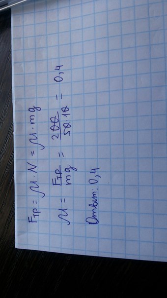 тело массой 50 килограмм под действием силы в 200 н равномерно движется по ровной дороге. Чему равен коэффициент трения?