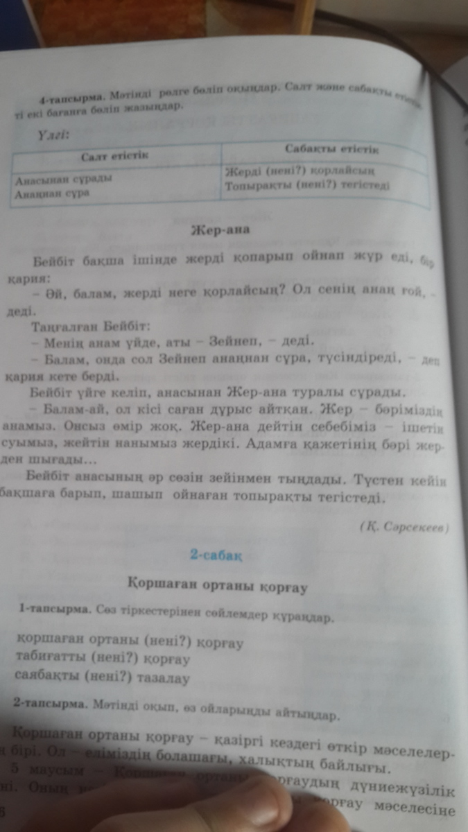 Бейбит однажды игрался в саду и ковырял землю. К нему подошла одна женщина и говорит: Эй дитя, почему ты ковыряешь землю, ведь она твоя мать.Бейбит отвечает : моя мать дома, ее зовут Зейнеп. Тогда спроси у своей маме , она тебе объяснит, сказала и ушла.Тогда Бейбит подошел к своей маме и спрашивает у нее про матушку- Землю. Эта женщина тебе правильно сказала. Земля- наша мать.Без нее нет жизни.Все что нужно человеку, выходит из земли. Бейбит внимательно послушал. И к вечеру пошел в сад , чтобы улучшить почву.