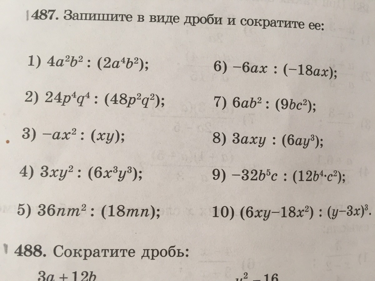 frac{4a^2b^2}{2a^4b^2} =frac{2}{a^2}; ;;  frac{24p^4q^4}{48p^2q^2} = frac{p^2q^2}{2} ; ;;  frac{-ax^2}{xy} = frac{-ax}{y} ; ;;  frac{3xy^2}{6x^3y^3} = frac{1}{2x^2y} ; ;\\ frac{36nm^2}{18mn} = frac{2m}{1} =2m; ;;  frac{-6ax}{-18ax} = frac{1}{3} ; ;;  frac{6ab^2}{9bc^2} = frac{2ab}{3c^2} ; ;;  frac{3axy}{6ay^3} = frac{x}{2y^2} ; ;\\ frac{-32b^5c}{12b^4c^2} = -frac{8b}{3c} ; ;;  frac{6xy-18x^2}{(y-3x)^3} = frac{6x(y-3x)}{(y-3x)^3} = frac{6x}{(y-3x)^2}