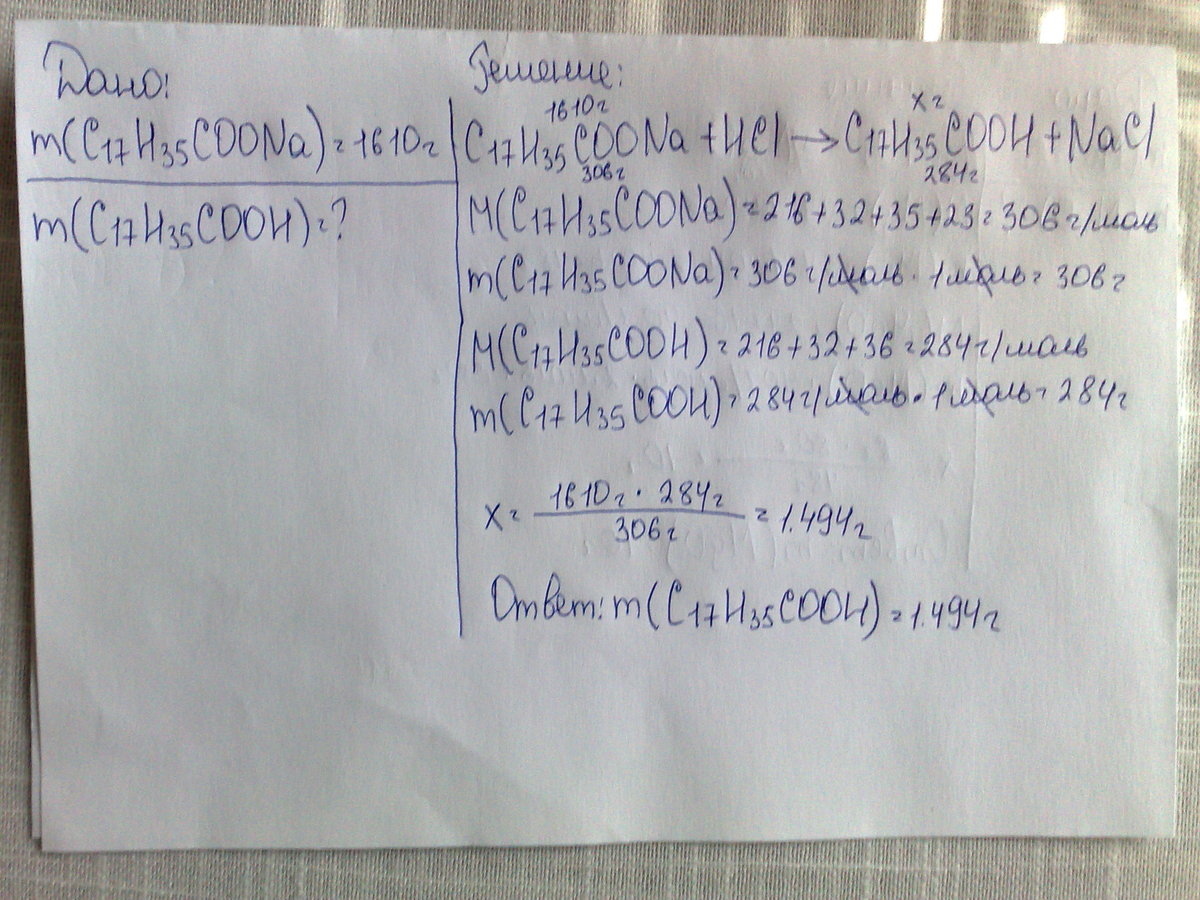 Какую массу стеариновой кислоты можно получить из хозяйственного мыла, содержащего 1610г стеарата натрия при действии на него соляной кислоты?