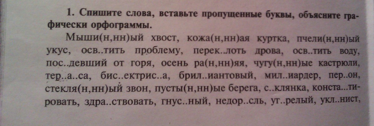 мышиный хвост, кожаная куртка, пчелиный укус, осветить проблему, переколоть дрова, освятить воду, поседевший от горя, осень ранняя, чугунные кастрюли, терраса, бриллиантовый, миллиардер, перрон, стеклянный звон, пустынные берега, здравствовать, гнусный, недорасль, угорелый, уклонись.