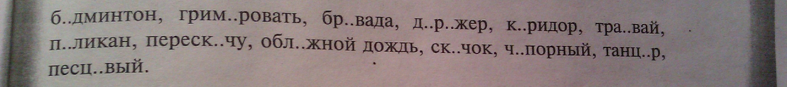 бадминтон, гримировать, дирижер, коридор, трамвай, пеликан, перескачу, скачок, чопорный, танцор, песцовый.