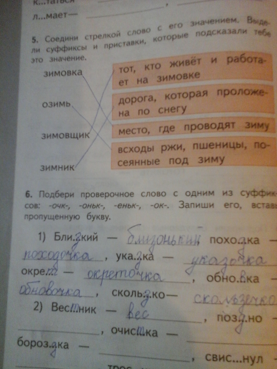 Подбери проверочное слово с одним из суффиксов: -очк-, -оньк-, -еньк-, -ок-. Запиши его, вставь пропущенную букву