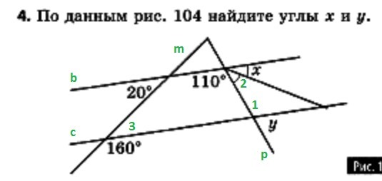 Угол 20° и ∠3 равны, являются накрест лежащими при секущей m ⇒ b║c.